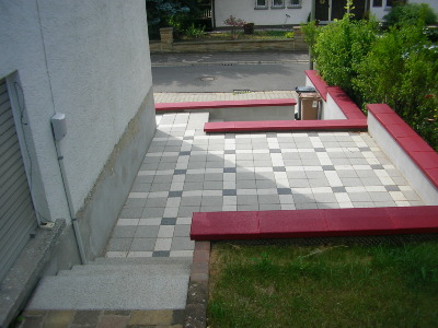 Terrassenplatten verlegt und mit Granit - Kopsteinpflaster eingefasst.
